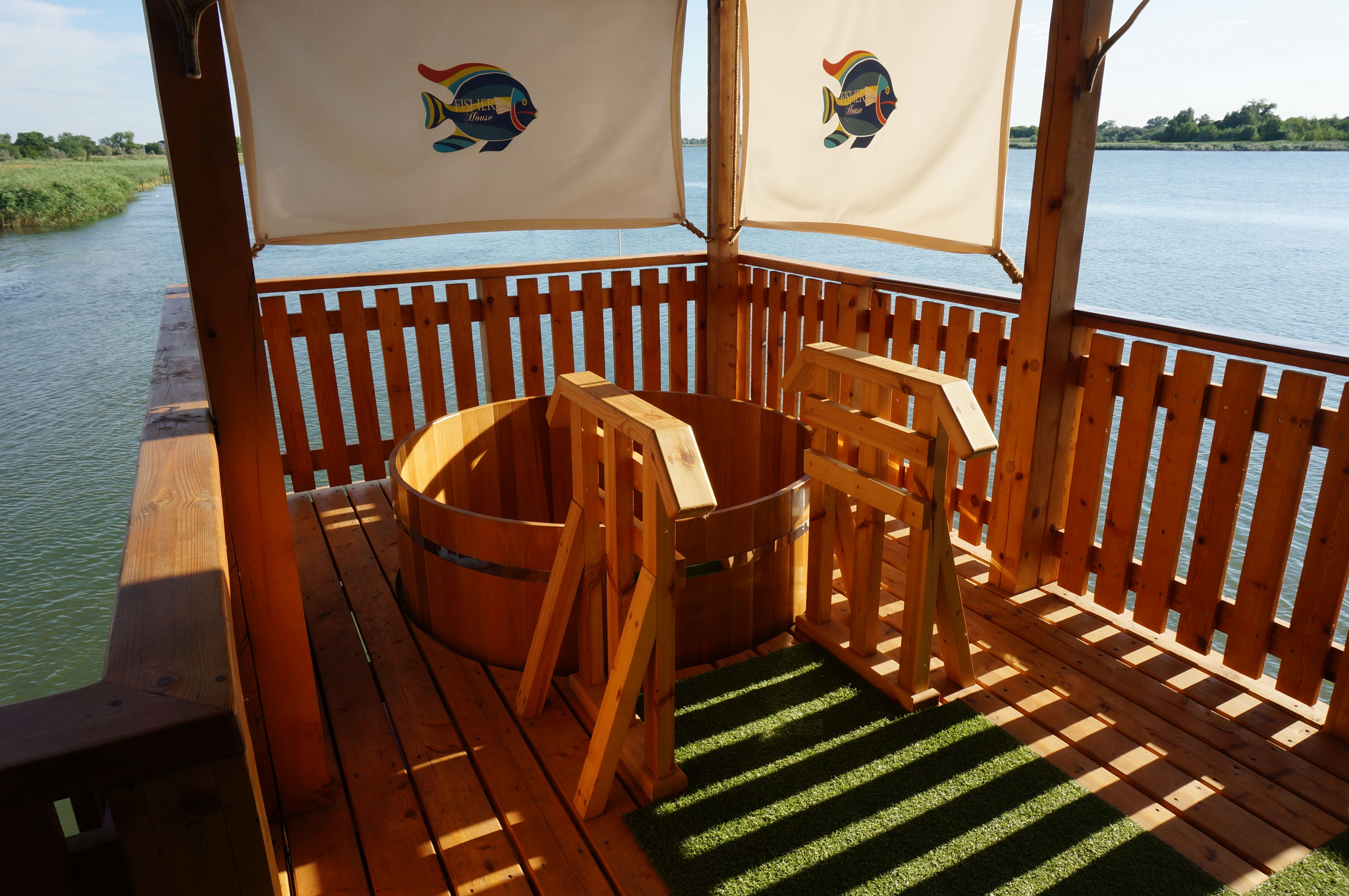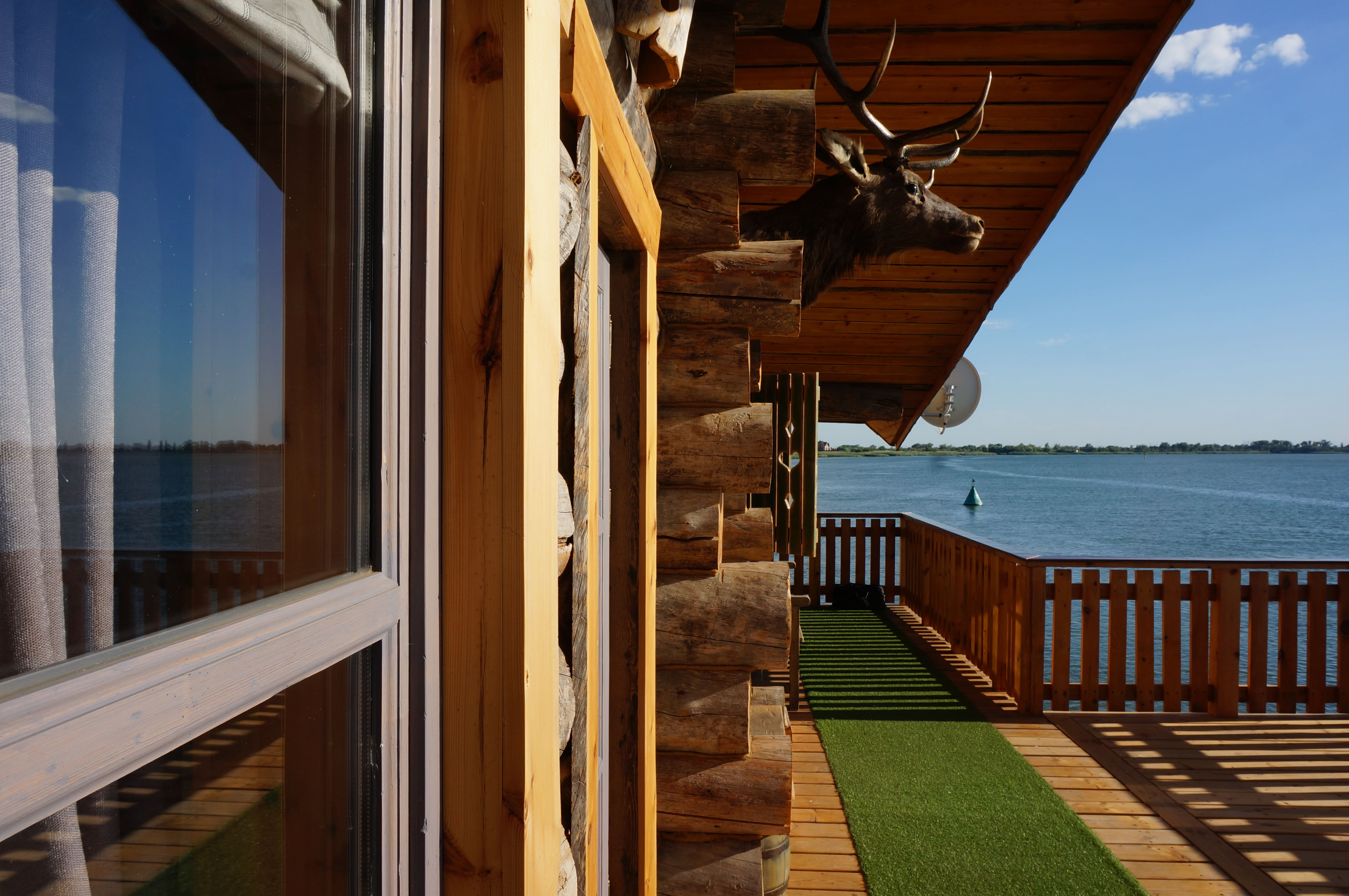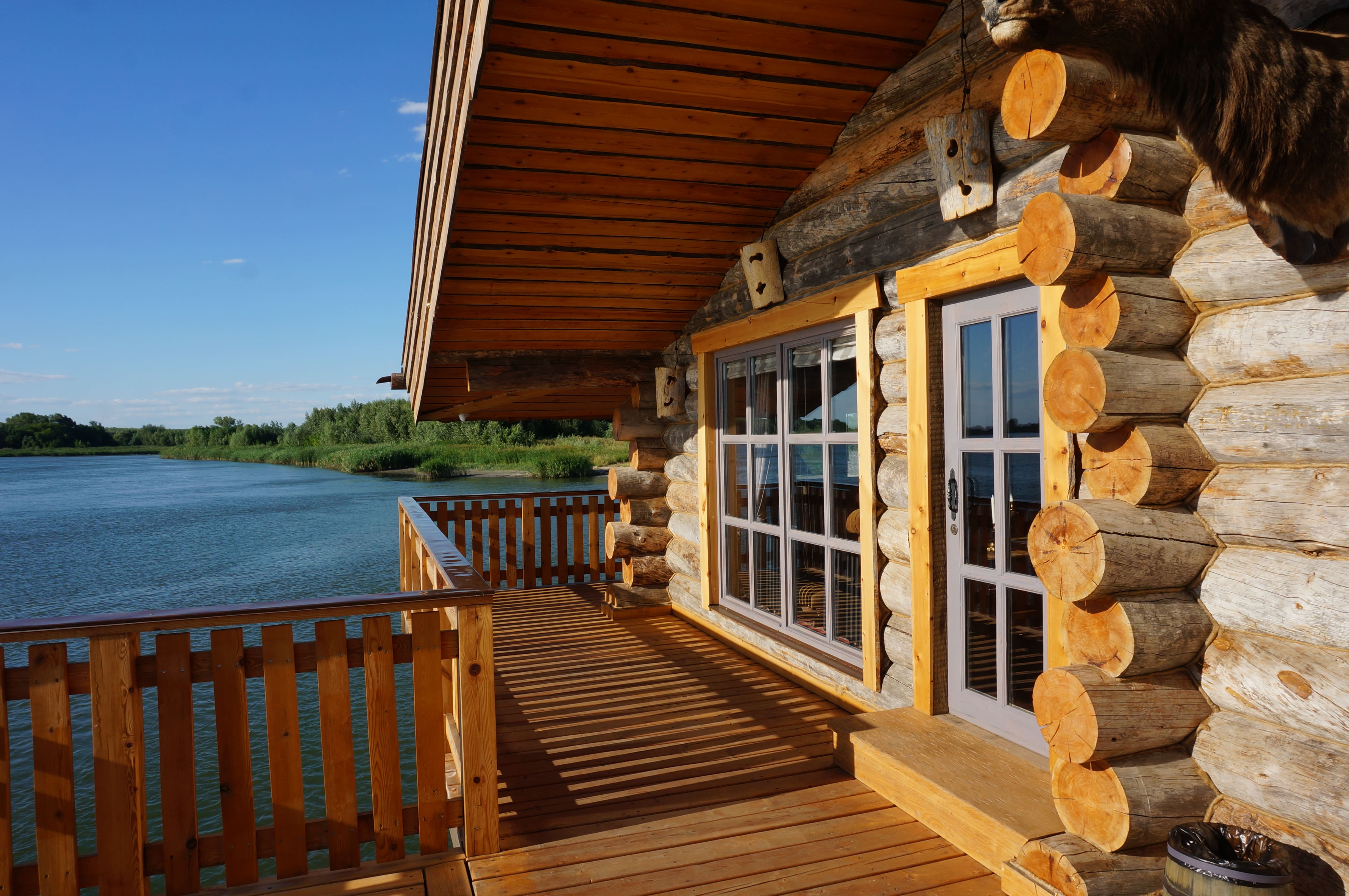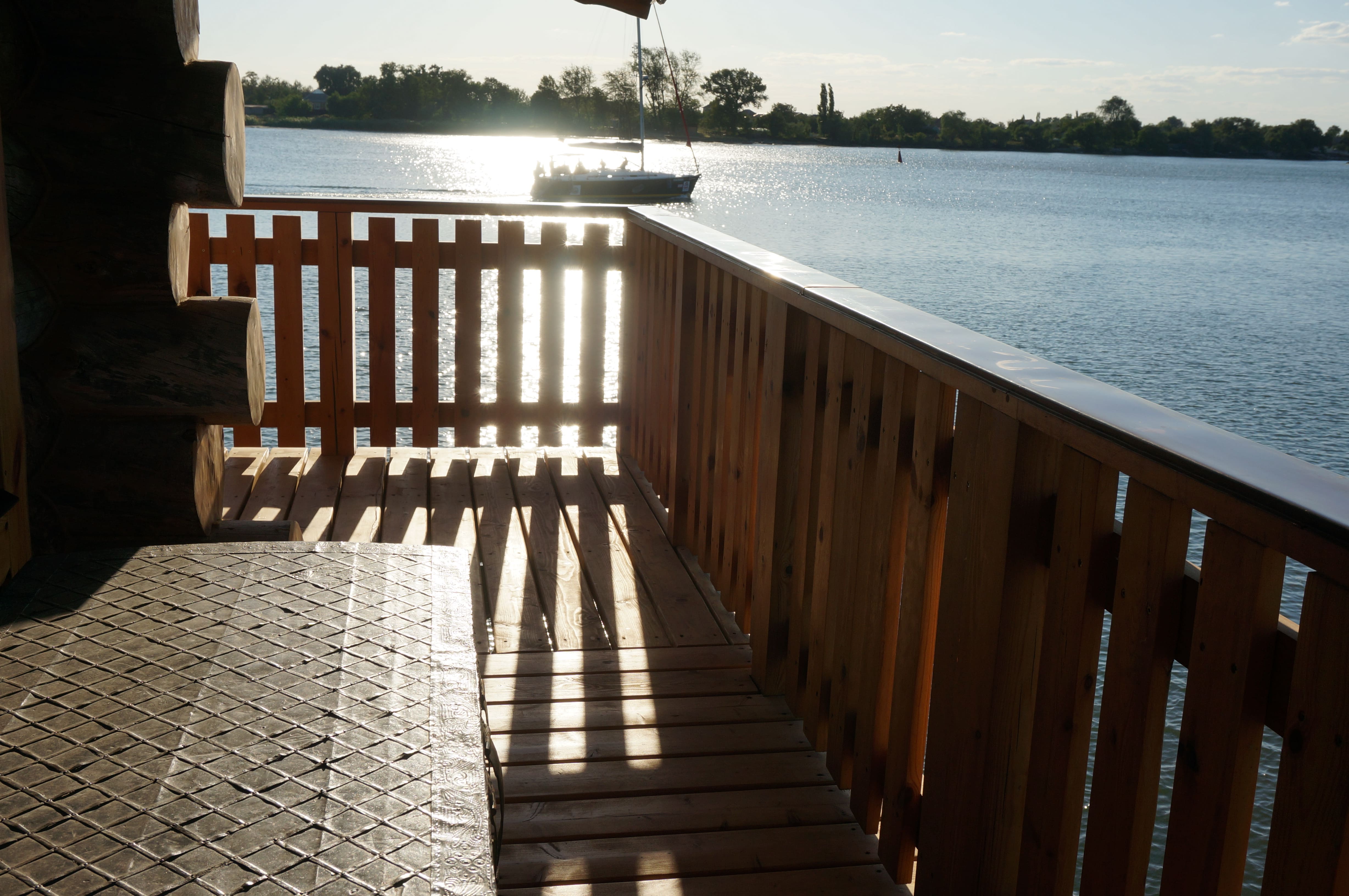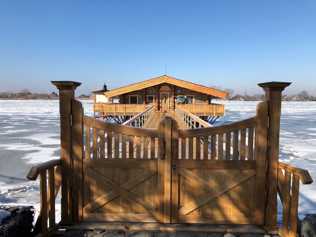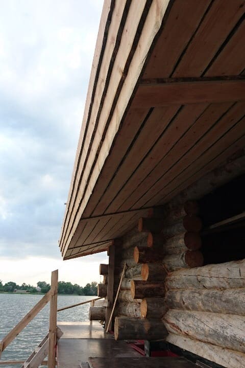 Уникальная баня из кело площадью 120 м², расположенная прямо над водой на берегу реки в Ростове. Здание установлено на свайном основании и соединено с берегом деревянным мостом, создавая эффект уединённого отдыха на воде. Проект выполнен из сухостойной сосны кело в традициях северного деревянного зодчества. Использован массивный сруб большого диаметра, широкие свесы кровли и просторные террасы с панорамным видом на реку. На открытой террасе размещена деревянная купель, позволяющая наслаждаться отдыхом на свежем воздухе круглый год. Внутри предусмотрены комната отдыха, душевая зона и классическая русская парная из натуральной древесины. Баня из кело сочетает природную эстетику, долговечность и высокий уровень комфорта. Такие проекты особенно востребованы для загородных участков у воды и могут быть реализованы под ключ с учётом индивидуальных пожеланий заказчика. Наша компания выполняет проектирование, изготовление срубов из кело и строительство бань любой сложности.