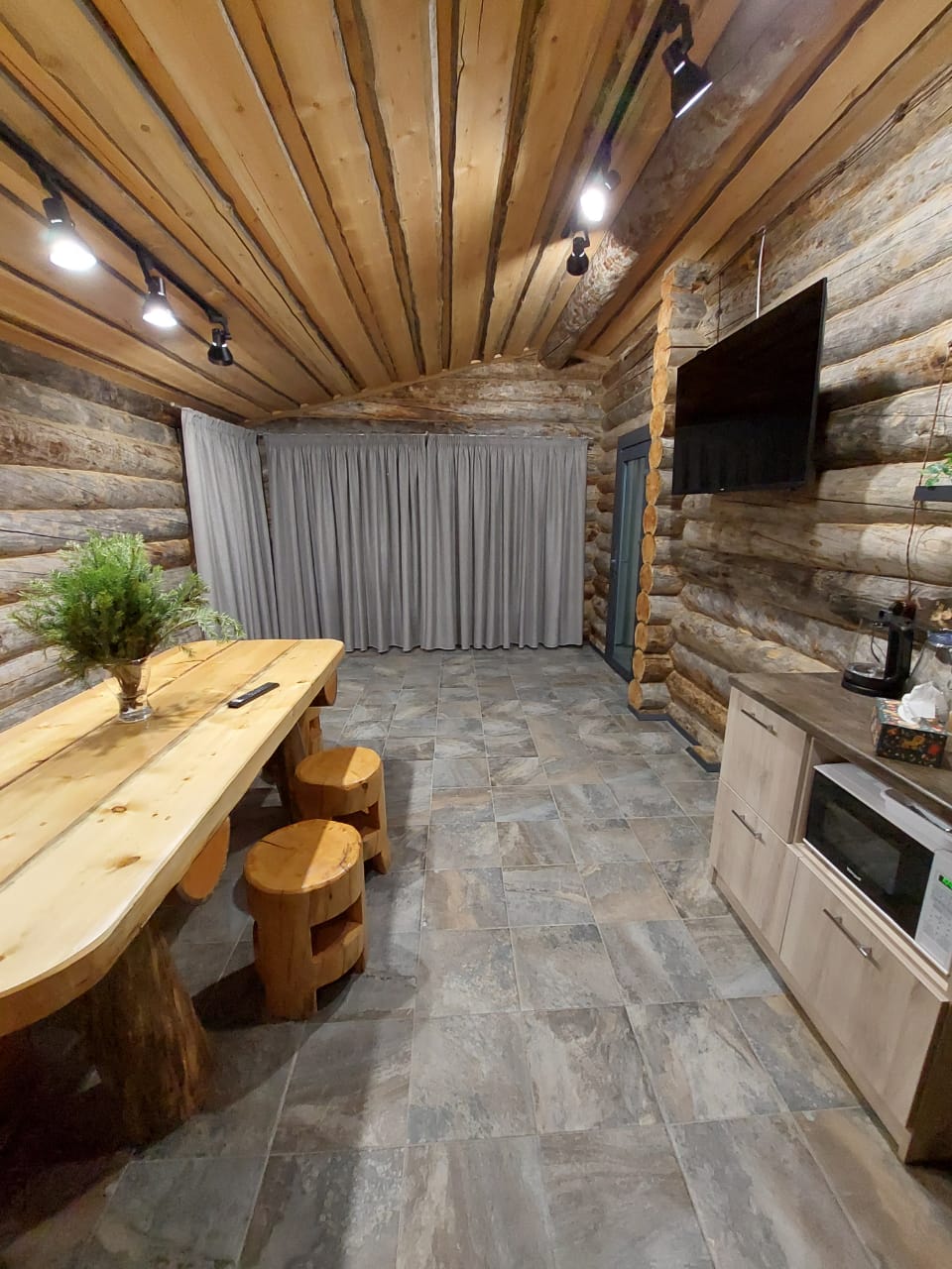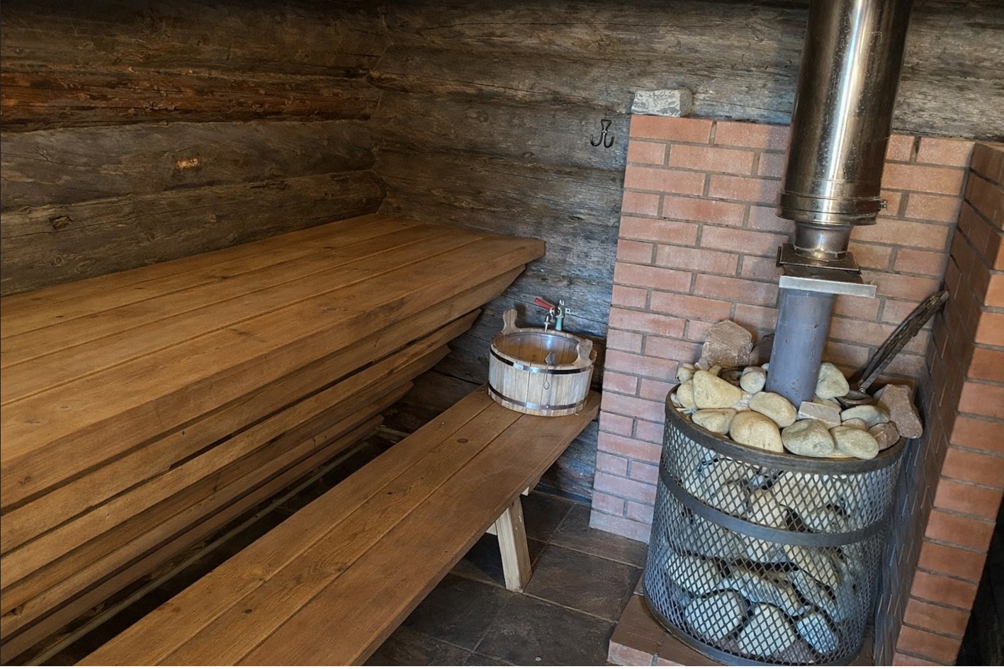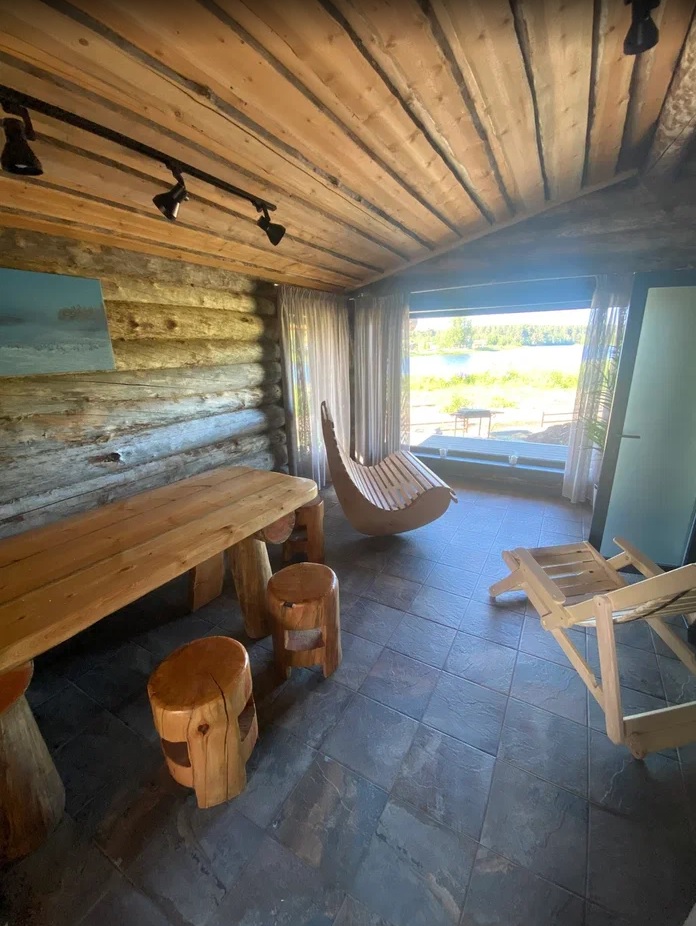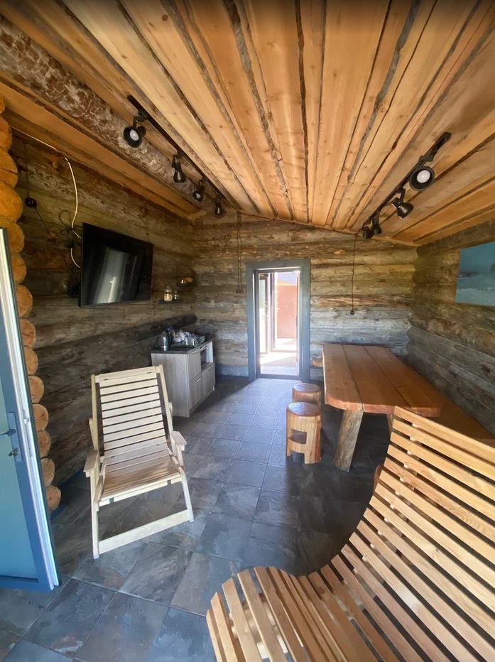 Проект включает просторную парную, моечную и зону релакса. Отделка выполнена из натуральной древесины.