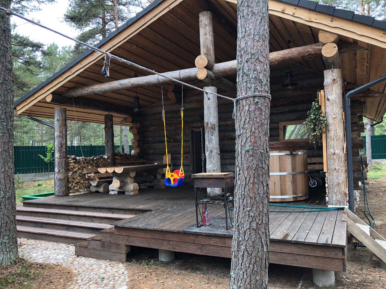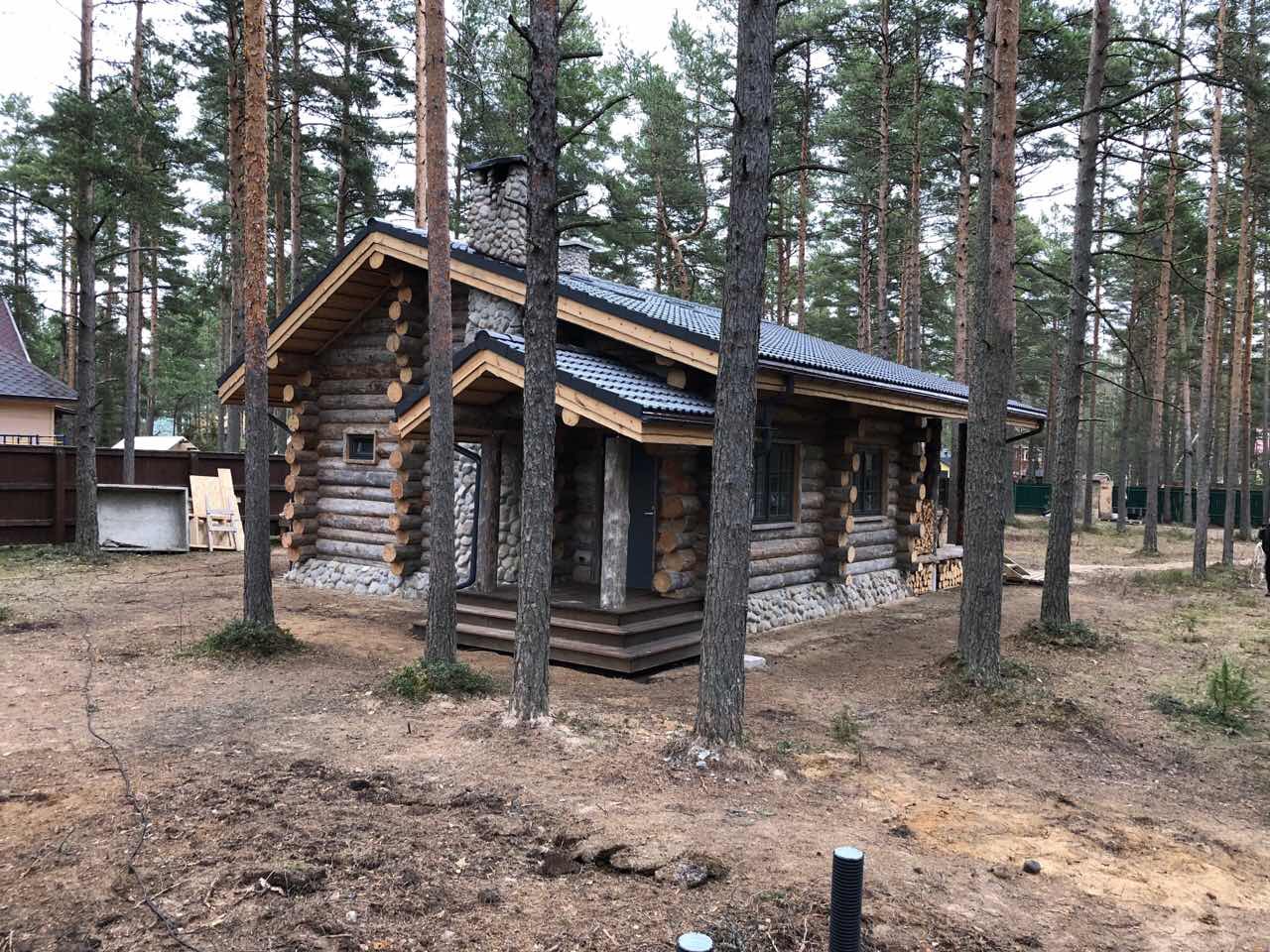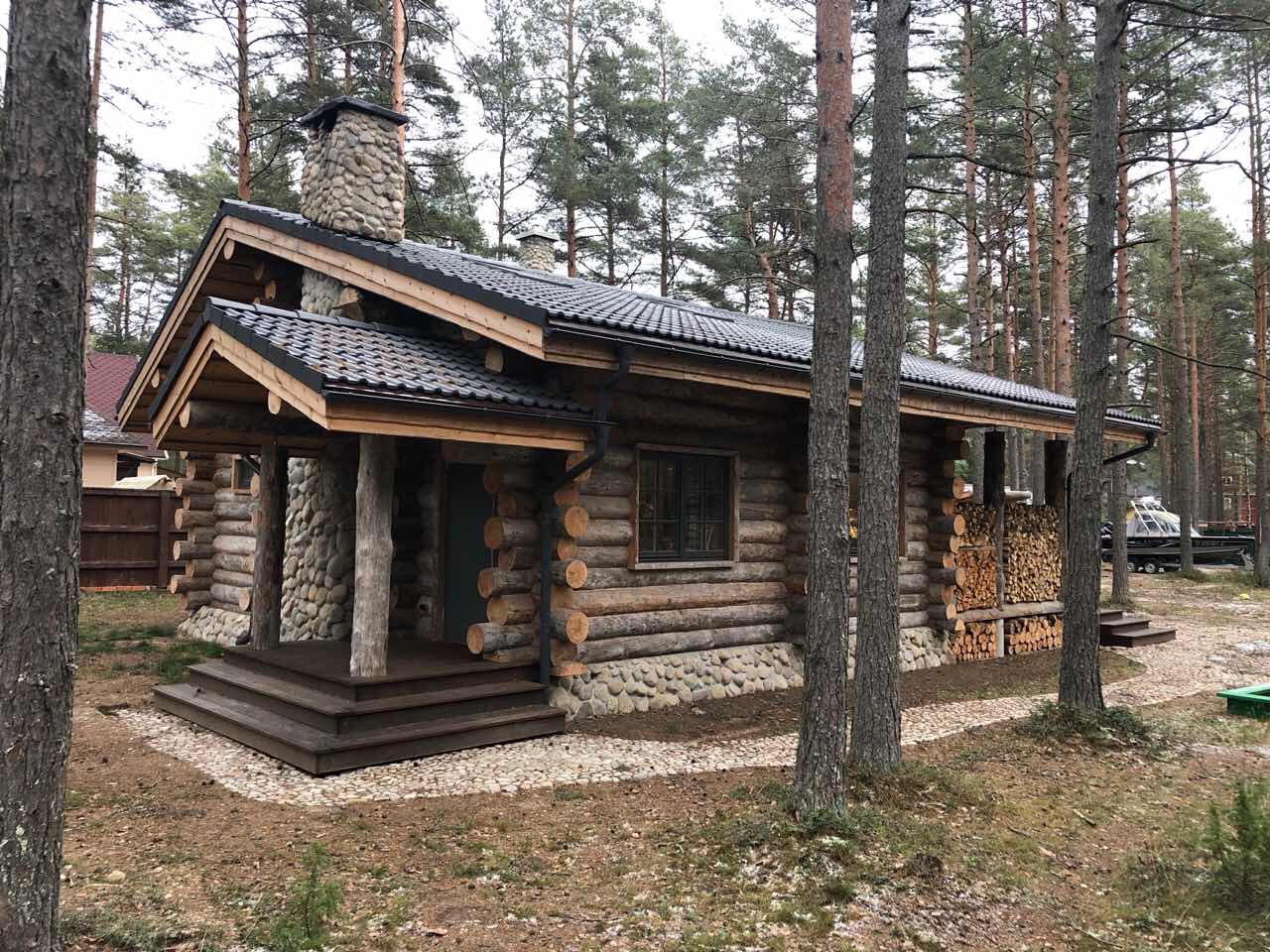 Баня из кело 7×7 м с просторной террасой, построенная в Ленинградской области. Проект сочетает традиционную северную архитектуру и современный комфорт: массивные бревна, каменная печь, второй свет и панорамное остекление. Интерьер выполнен в едином стиле с использованием эксклюзивной мебели ручной работы из кело, создающей атмосферу уюта и природной аутентичности. Идеальное место для отдыха круглый год.