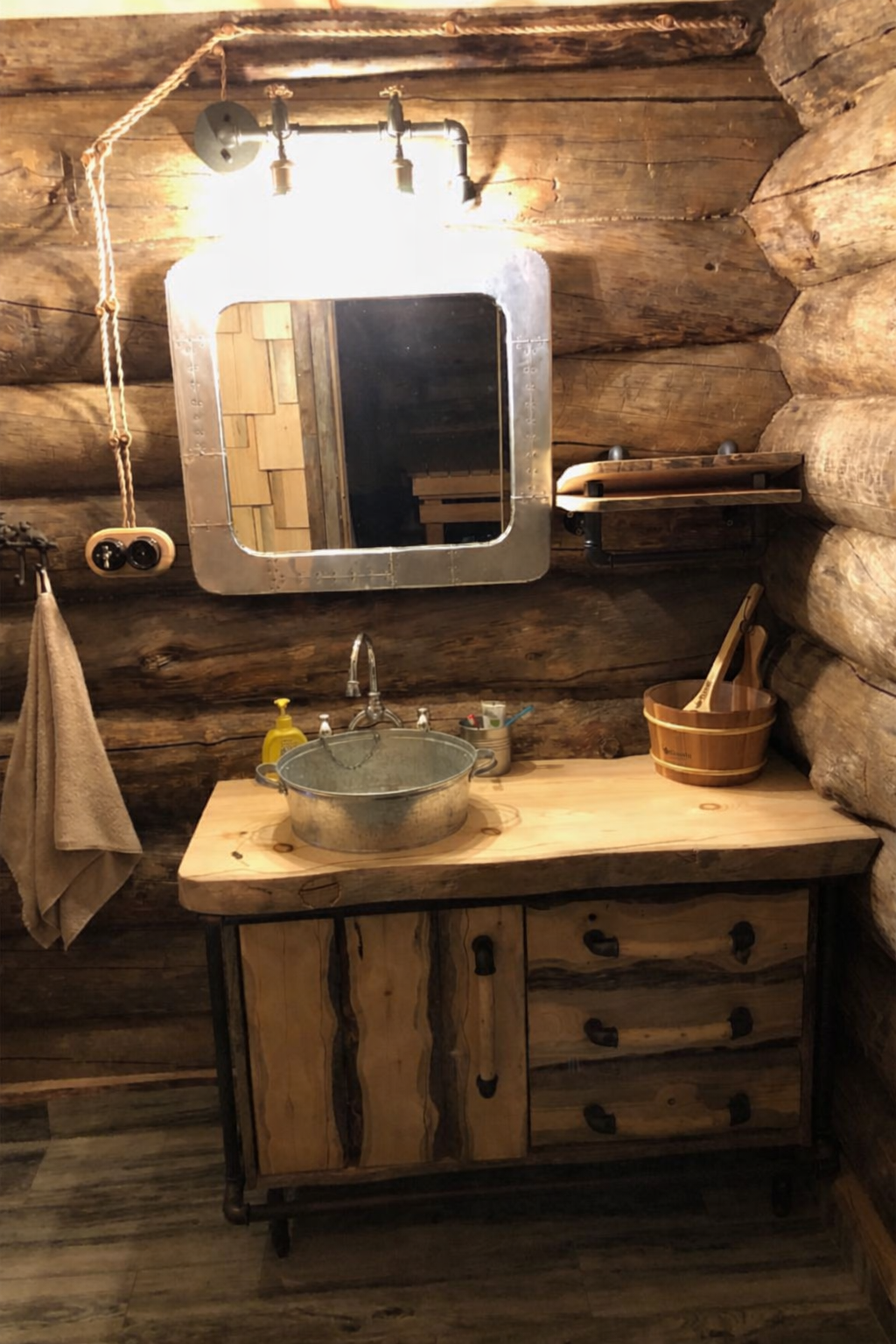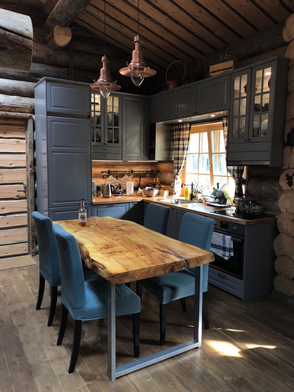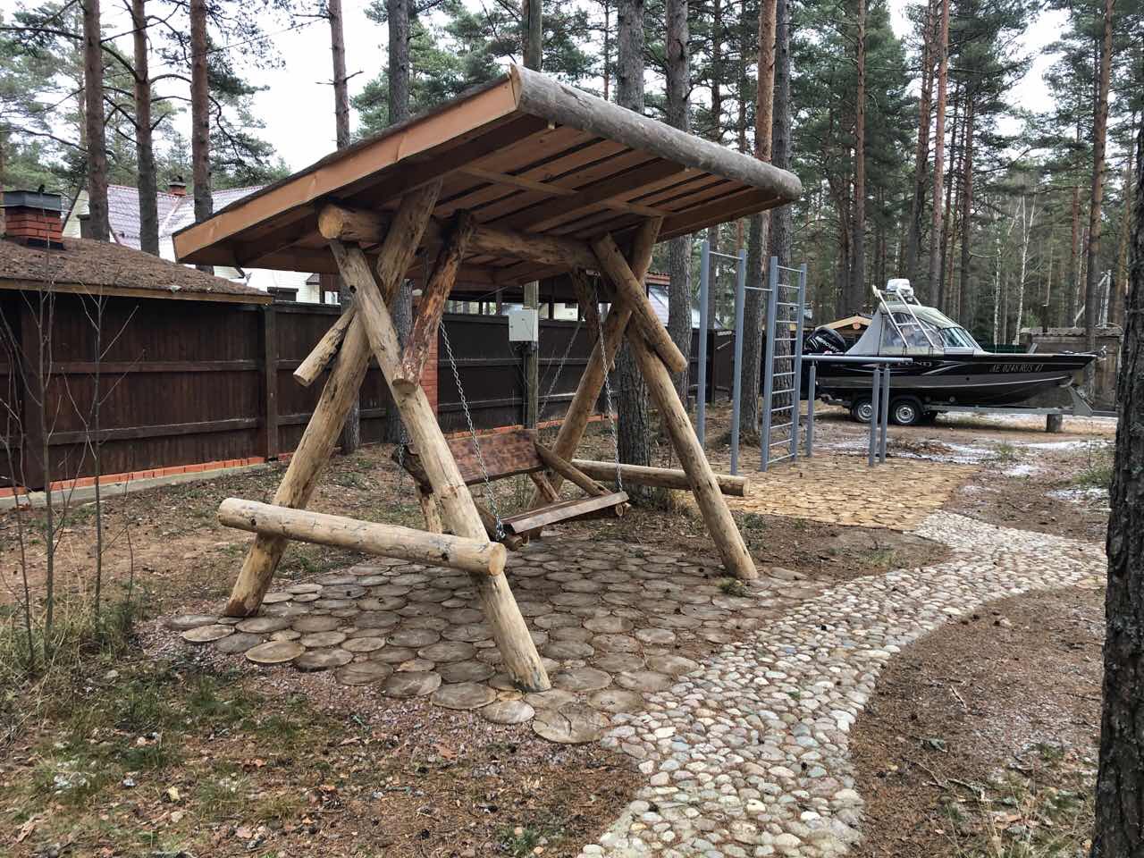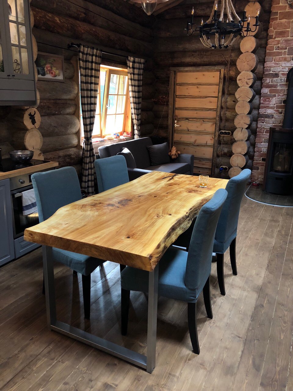 Баня из кело 7×7 м с просторной террасой, построенная в Ленинградской области. Проект сочетает традиционную северную архитектуру и современный комфорт: массивные бревна, каменная печь, второй свет и панорамное остекление. Интерьер выполнен в едином стиле с использованием эксклюзивной мебели ручной работы из кело, создающей атмосферу уюта и природной аутентичности. Идеальное место для отдыха круглый год.